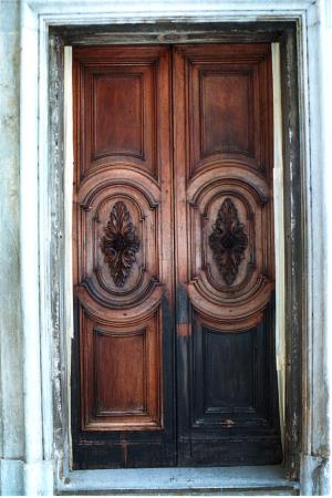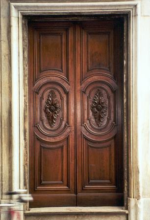 Chiesa Reale di San Lorenzo a Torino. Questo pregiato portoncino in legno noce rappresenta un ottimo esempio dell'arte dei minusieri torinesi all' inizio dell'800.