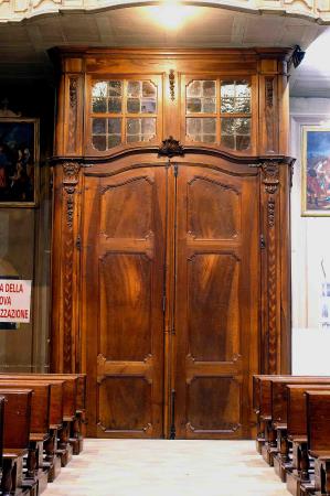 Pregevole ed imponente bussola lignea d' ingresso della chiesa parrocchiale SS. Gallo e Nicoḷ, costruita in legno noce nella seconda metà del XVIII sec.