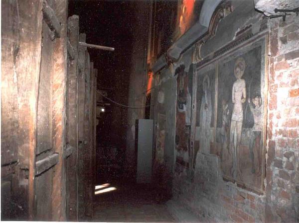 La parete a sinistra del coro fu scostata dal muro in quanto su questo erano emersi degli affreschi gotici, attualmente visibili.
