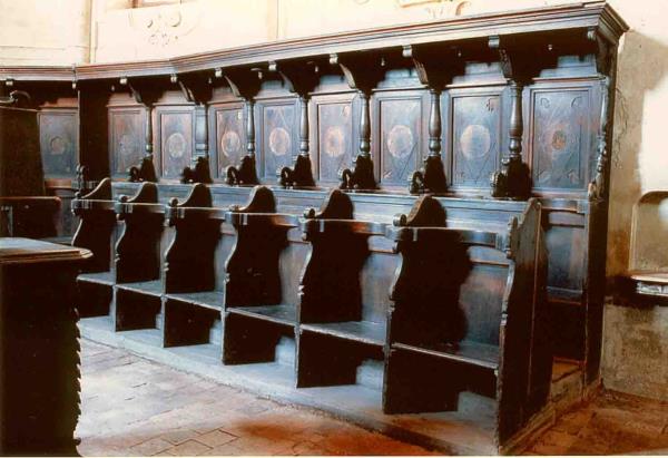 Tale coro risale alla XVI sec e si trova nella chiesa di S. Agostino a Carmagnola. Costruito in legno noce e ricco di intarsi e simboli "esoterici" quasi non visibili prima della pulitura. Tra le curiositą, in una mensolina č intarsiato un volto con "occhiali".