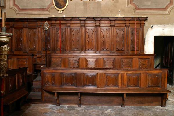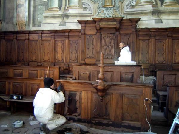 In questo caso il manufatto era particolarmente infestato da insetti xylofagi (tarli) e vi erano letteralmente milioni di fori dei tarli. Con la Soprintendenza si č deciso di stuccarli, in modo da dare una continuitą di lettura al manufatto.
