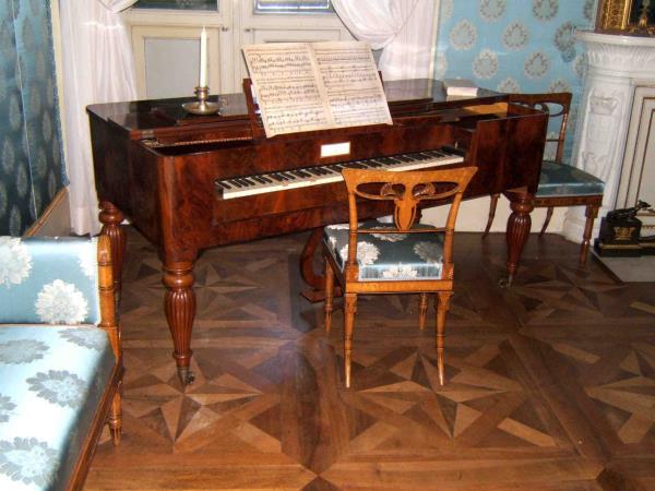 Il pianoforte, interamente lastonato in mogano (a parte le gambe tornite e intagliate in mogano massello) fa parte degli arredi di Carlo Alberto nel Castello di Racconigi. ed è stato restaurato sul posto.