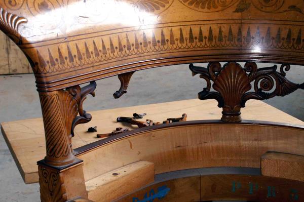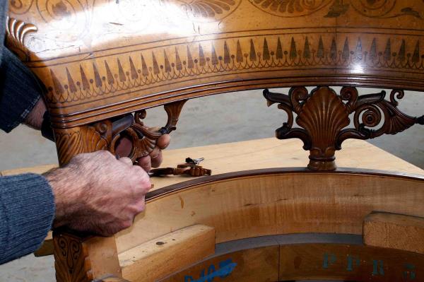 La poltrona, di esecuzione magistrale, è in legno acero con filettature e intarsi in legno palissandro.
