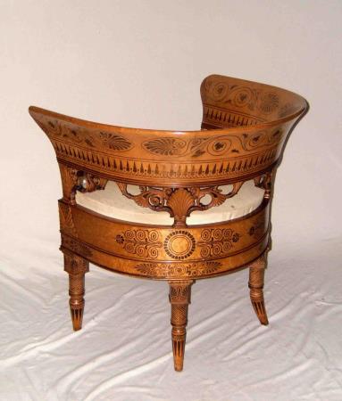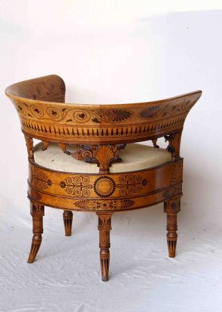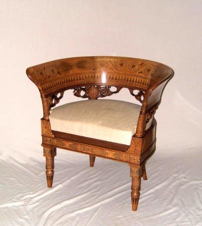 Tale manufatto appartiene agli arredi di Carlo Alberto nel Castello di Racconigi (CN). la poltroncina è attribuita al famoso ebanista dell'800 Gabriele Capello detto "il Moncalvo" (per la sua provenienza da Moncalvo d'Asti).