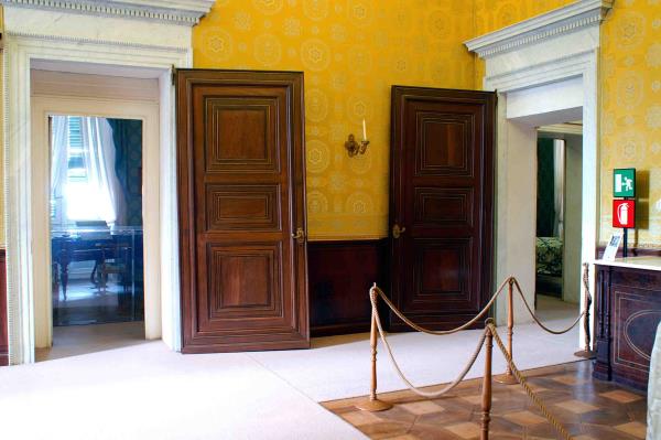 Tra le porte spicca la c.d. "porta del Pregadio", costruita in noce, impiallicciata in palissandro e con filetti eseguiti magistralmente (dato la complessitą del disegno) in acero.