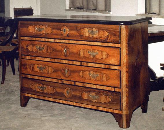 Il cassettone fu costruito nel basso piemonte nel XVIII secolo in legno noce con applicate "formelle" di ulivo sui cassetti e lastronature di noce sulle traversine e sui montanti.
