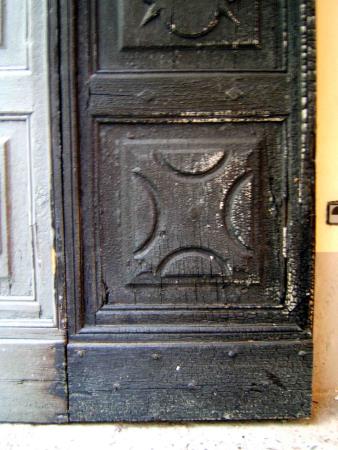 Mi domando cosa fosse accaduto se si fosse trattato di un portone costruito in tempi moderni, ma ho il sospetto che si sarebbe completamente incenerito. Questo perchè il legno impiegato in origine (nel XVII sec.) era noce durame (la parte centrale e più scura del tronco) di qualità eccelsa che nell' arco di 350 anni circa è ulteriormente stagionato indurendosi sempre di più e diventando più resistente al fuoco.