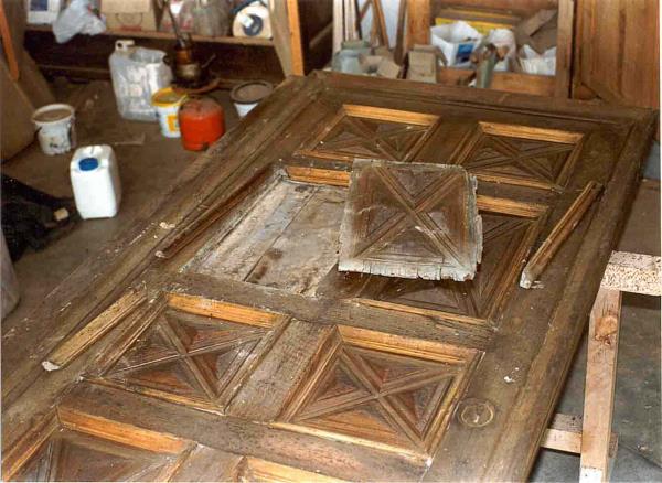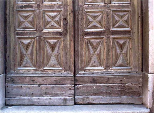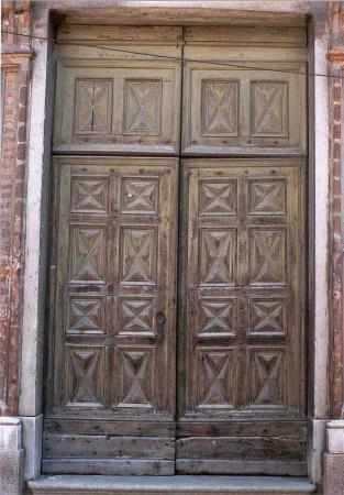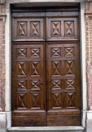 Bra CN - Chiesa di Santa Croce - Portone ligneo Epoca prima metà del XVIII secolo. Legno Noce e modanature, sostituite verso fine '800, in pioppo.