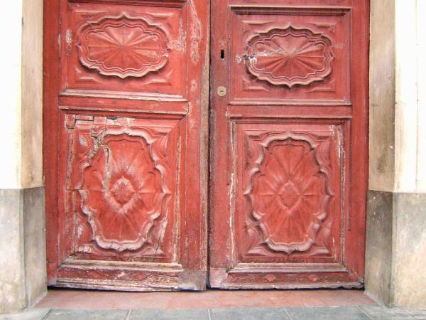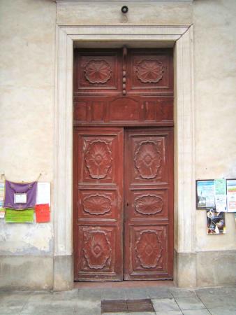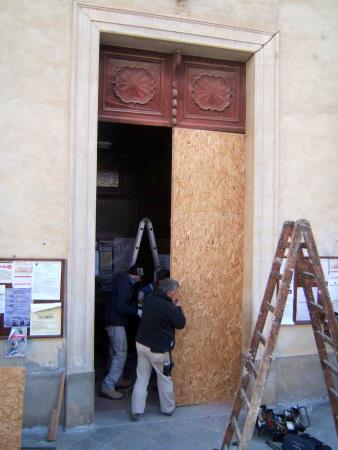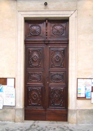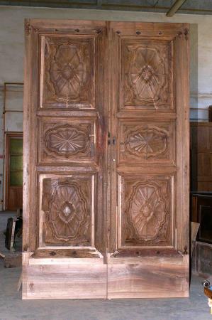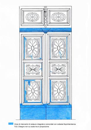 Il portone in oggetto ha subito notevoli modifiche strutturali in epoca passata. Probabilmente fu adattato ma non è nato per la sede attuale. Siccome l' apertura muraria era molto più alta del portone ligneo, chi l' ha piazzata ha posto uno schienale di cassapanca a chiusura dello spazio rimasto. In questo intervento si è deciso, con la soprintendenza e la committenza, di asportare tale elemento non coerente e di stile diverso e di alzare la porta da sotto con l' inserimento di una adeguata base.