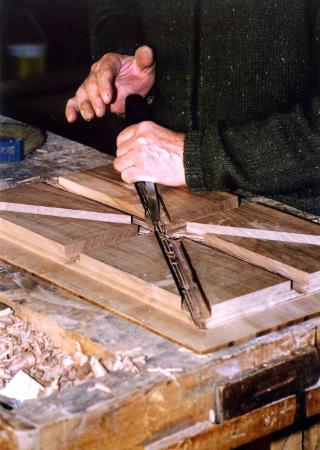 Il telaio è stato asportato e portato nel Laboratorio dove sono state integrate le parti mancanti e si è ricomposta la struttura. I pannelli sono stati ricostruiti in noce durame e intagliati a mano sul modello ricavato da una vecchia fotografia.