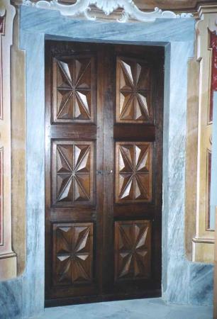 Questa porta, sita nella cappella del castello di Magliano Alfieri, fu oggetto del furto dei pregevoli pannelli seicenteschi a punta di diamante.