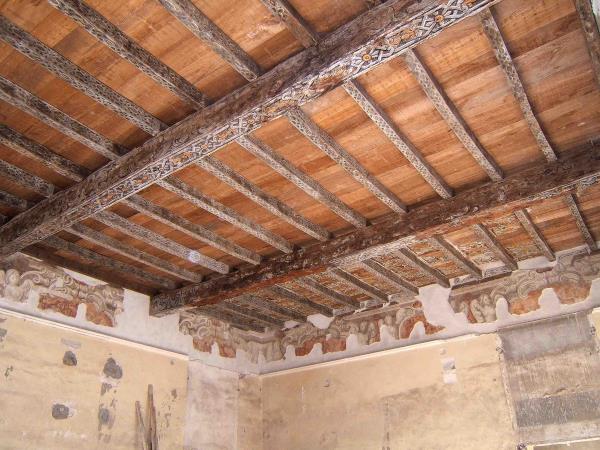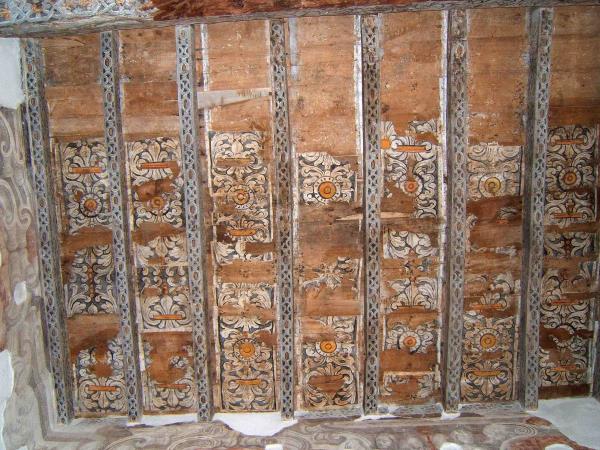 In questo caso le tavole in legno pioppo, probabilmente giudicate in gran parte irrecuperabili, furono in passato completamente asportate e sostituite con un assito provvisorio in legno abete. Fortunatamente, grazie ad una minuziosa ricerca degli storici e dei sovrintendenti, furono rinvenute in uno scantinato alcune assi del soffitto.