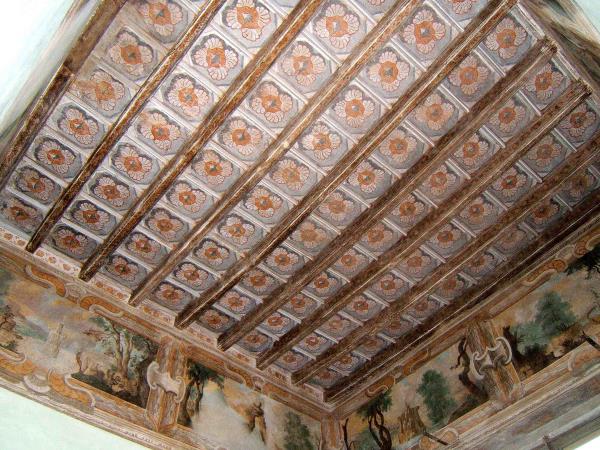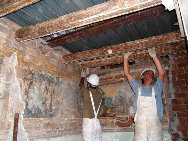 Nella fotografia prima del restauro si nota lo "spanciamento" centrale a causa della parziale rottura dei travetti di sostegno. inoltre il tavolato in legno pioppo, sulla parte superiore non visibile, era oggetto di vaste infestazioni di tarli e di funghi del marcimento. In fase di restauro il soffitto è stato smontato in ogni sua parte lasciando solo i tre grossi travi portanti, che risultavano ben ancorati.